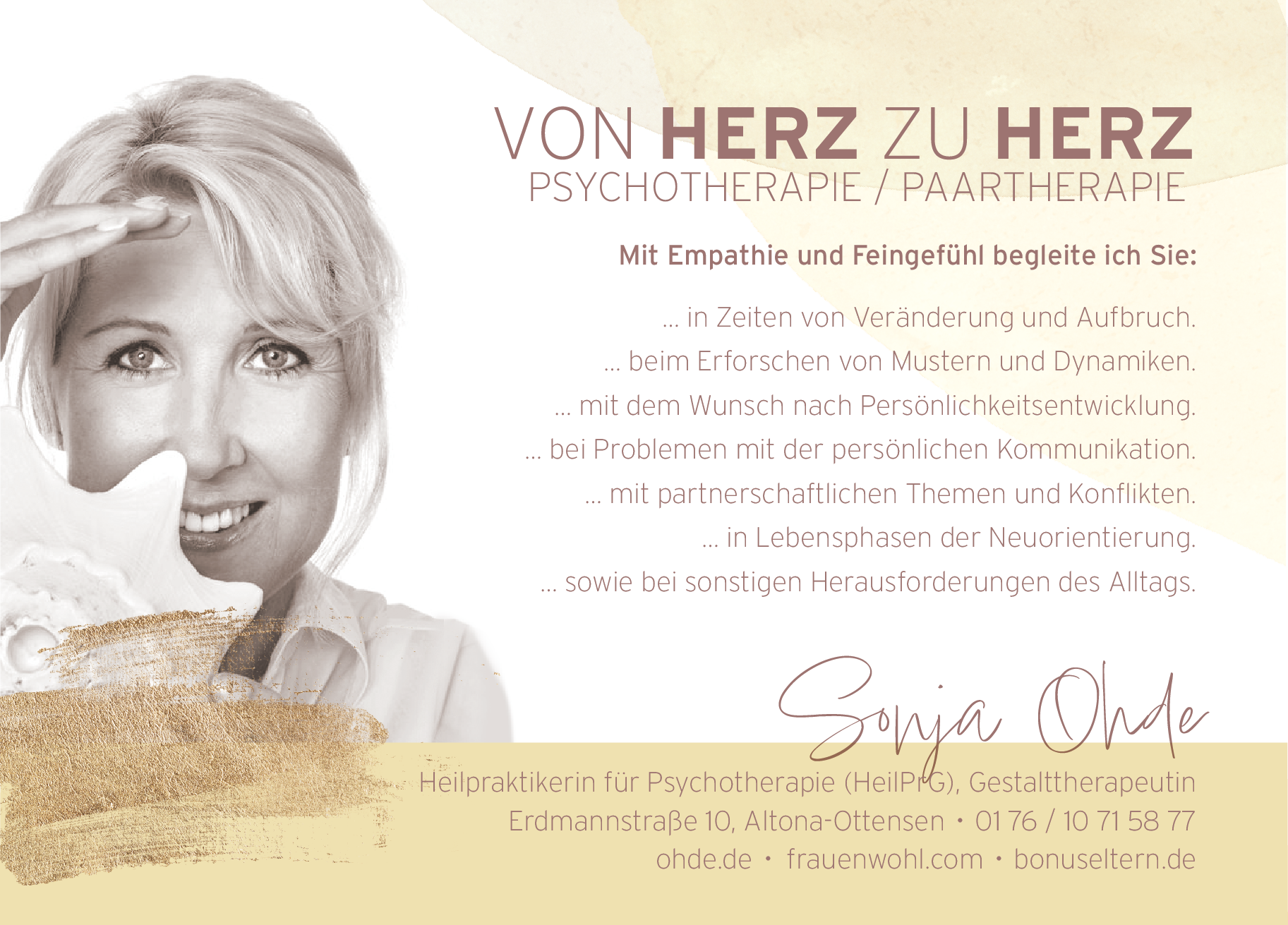 Meine empathische, zugewandte und akzeptierende Grundhaltung schafft eine Atmosphäre, in der Sie sich Ihrer Gedanken, Gefühle und Bedürfnisse aber auch Ihrer automatisierten Haltungen und Verhaltensmuster bewusst werden können.